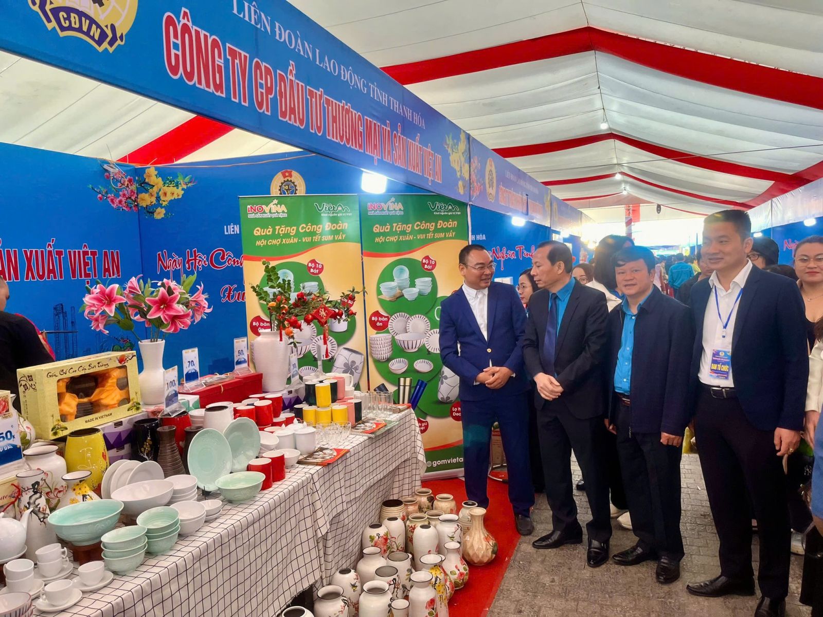 Ông Võ Mạnh Sơn, Chủ tịch LĐLĐ tỉnh Thanh Hóa cùng ban lãnh đạo LĐLĐ thăm gian hàng Việt An